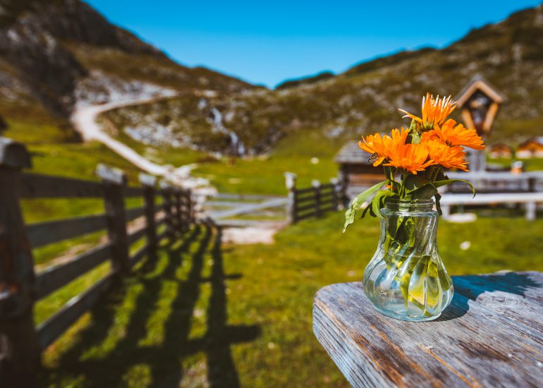 There the landlady gladly serves a homemade tea and invites you to stay. Here you can enjoy the view of the valley and the surrounding mountains in peace and quiet, because the only thing you hear at this early time are the bells of the grazing alpine cows.